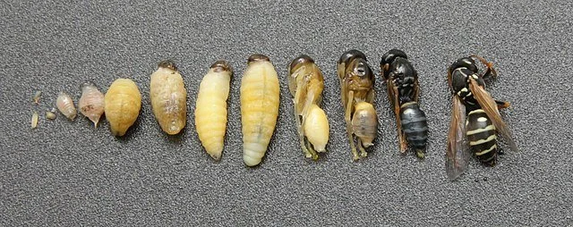 Wasps go through a metamorphosis just like butterflies and bees. They have four stages of development: egg, larvae, pupa, and adult.